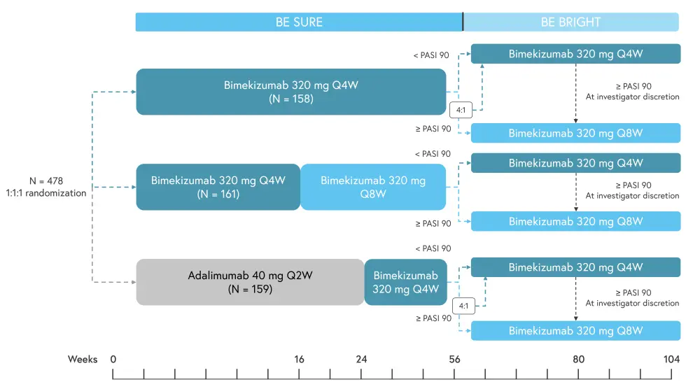 Overall, PASI 90 results were similar to Week-16 of BE SURE and were maintained to Week 104. In patients who were originally randomized adalimumab during BE SURE, there was an increased response after treatment was switched to bimekizumab at Week 24; this increase was also durable to Week 104.