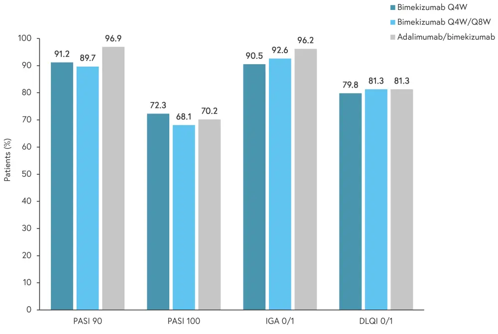 DLQI 0/1, Dermatology Life Quality Index score of 0 or 1; IGA 0/1, Investigator Global Assessment score of 0 or 1; PASI 90, % 90% improvement in Psoriasis Area and Severity index; PASI 100, 100% improvement in PASI; Q4W, every 4 weeks; Q8W, every 8 weeks.