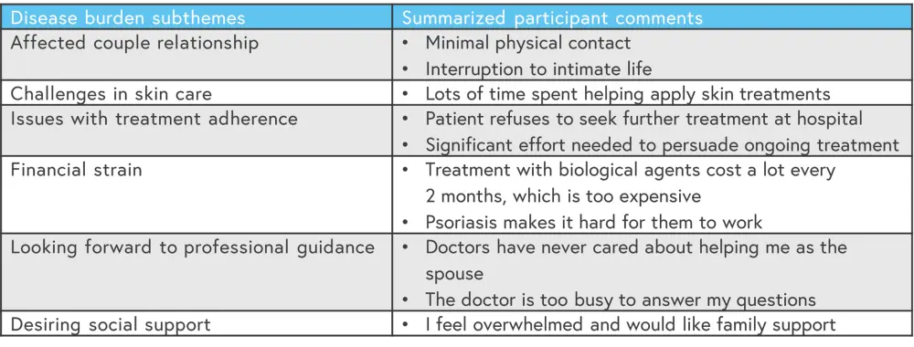 Here, we summarize a qualitative study by Wu et al.1 published in the Journal of Multidisciplinary Healthcare on the burden faced by and coping strategies of spouses of individuals with psoriasis.