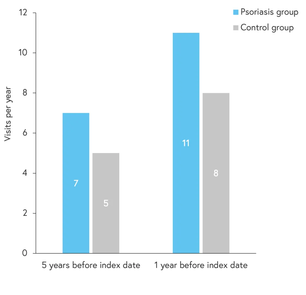 Patients with psoriasis were more likely to visit their doctor compared to the controls. The visit to the general practice increased by 60% from 1-year to 5-year period before the index date for patients with psoriasis (Figure 1) while the increase was less noticeable in the controls.