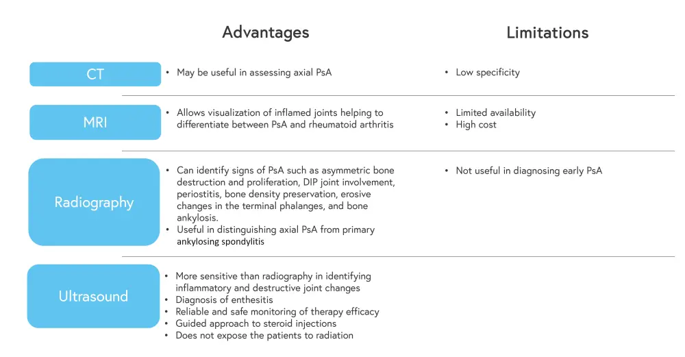 One of the most common tools used in the diagnosis of PsA is imaging. The advantages and limitations of each imaging technique are shown in Figure 4. The European Alliance of Associations for Rheumatology (EULAR) recommend that in patients with peripheral involvement and psoriasis or a family history of psoriasis, ultrasound or magnetic resonance imaging should be used.