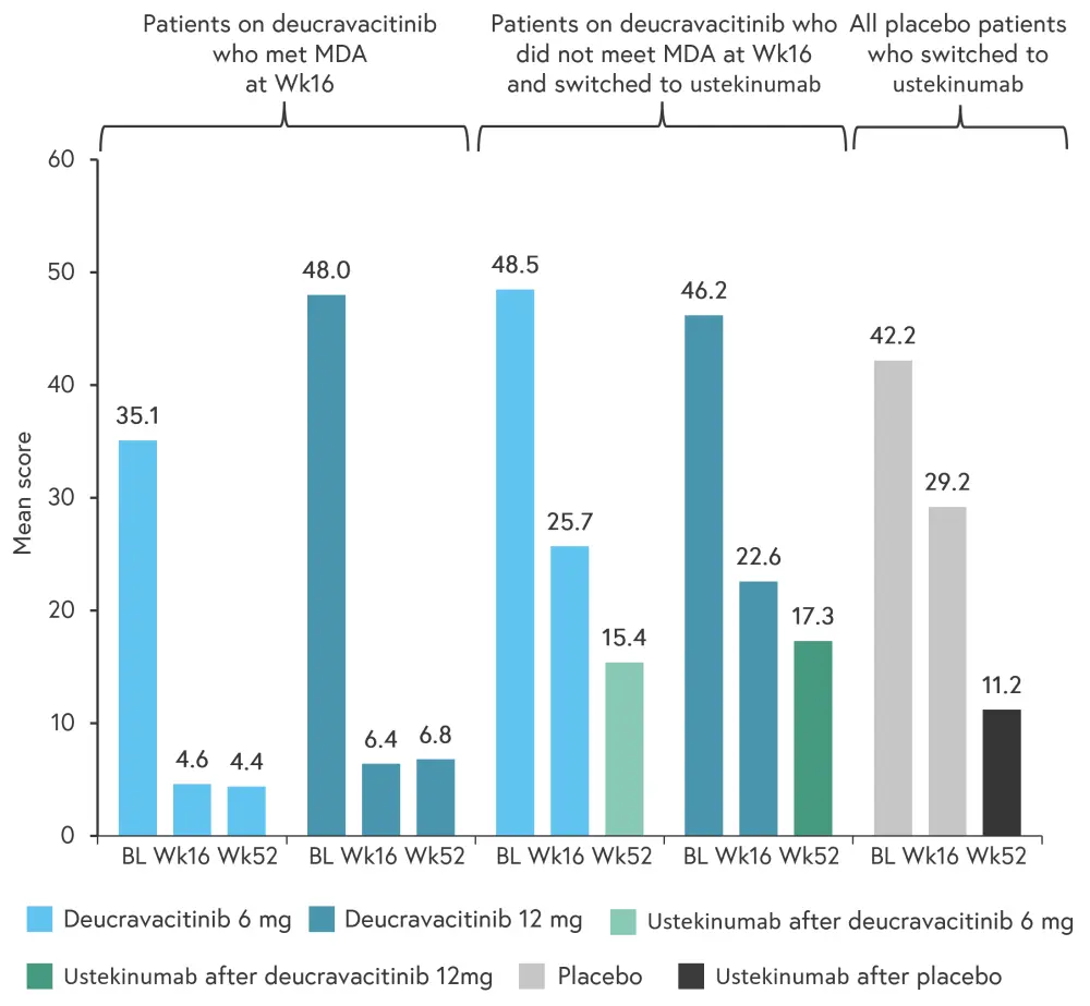 Patients treated with deucravacitinib through to Week 52 saw an ~3.5-point mean change in PASDAS score by Week 16 that was maintained to Week 52. Patients treated with deucravacitinib who did not meet MDA by Week 16 and placebo patients who switched to ustekinumab saw an ~3-point mean change in PASDAS by Week 52.