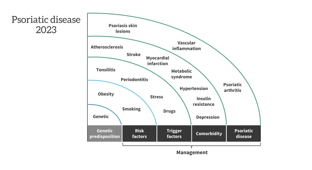 Mrowietz closes the discussion by sharing the spectrum of psoriatic disease (Figure 1), discussing how early treatment can be used to target multiple aspects of psoriatic disease, including its comorbidities.