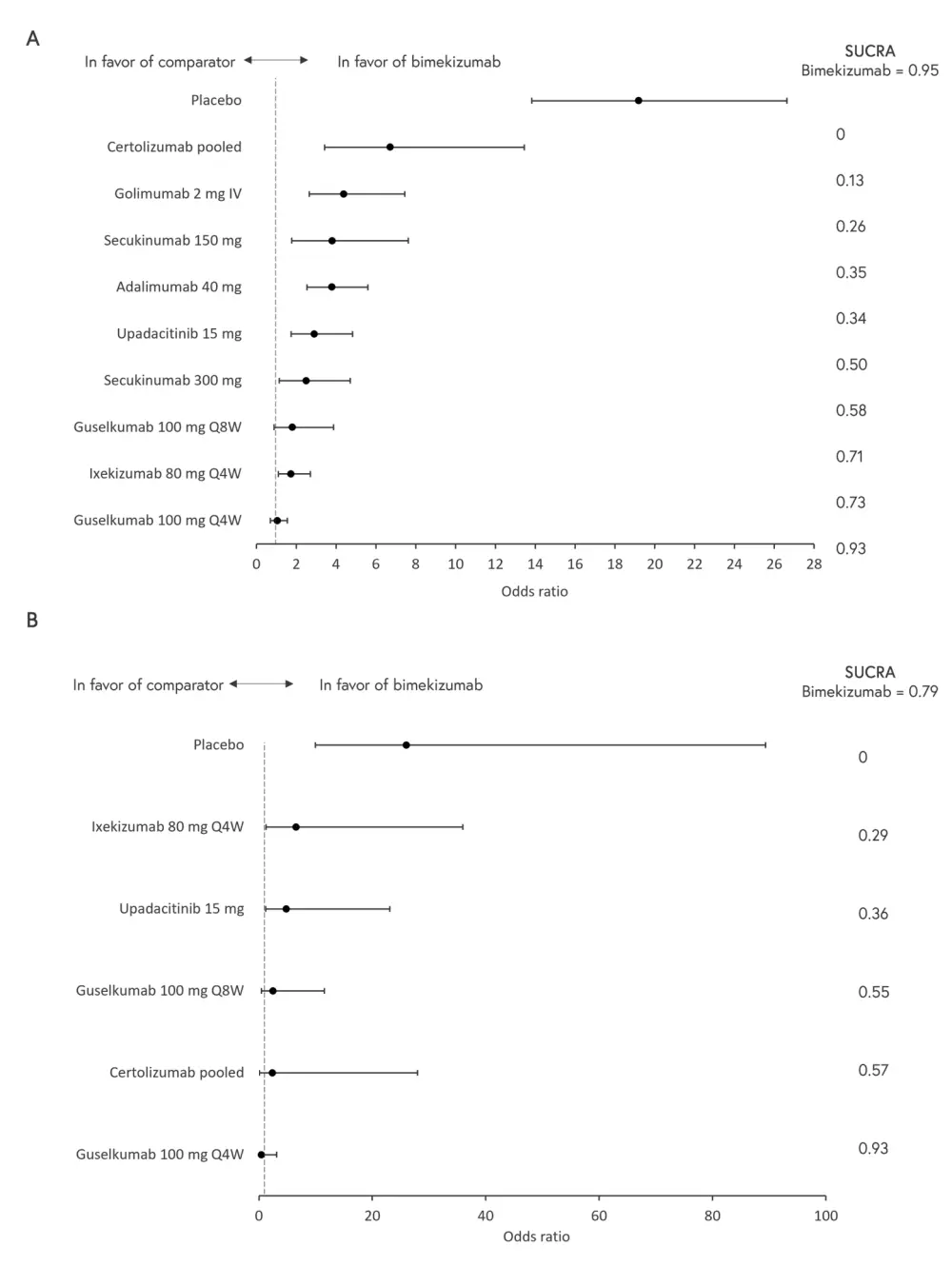 b/ts DMARD, biological or targeted synthetic disease-modifying anti-rheumatic drug; Q4W, every 4 weeks; Q8W, every 8 weeks; PASI, Psoriasis Area and Severity Index; SUCRA, surface under the cumulative ranking curve; TNFi, tumor necrosis factor inhibitor.