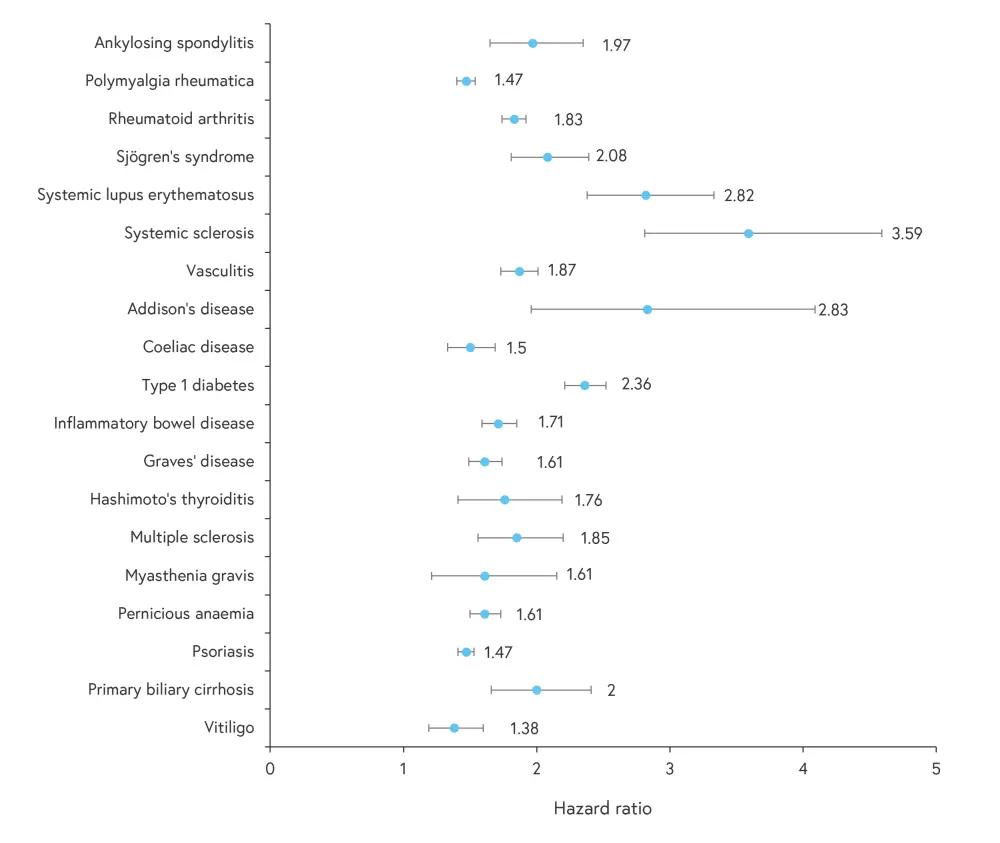 Conrad et al.1 recently published their data from a large-scale observational study in the Lancet, which evaluated multiple autoimmune disorders and the risk of multiple cardiovascular diseases. The study aimed to determine whether, and to what extent, autoimmune diseases are associated with increased risk of cardiovascular disease.1 We are pleased to provide a summary of their findings here.