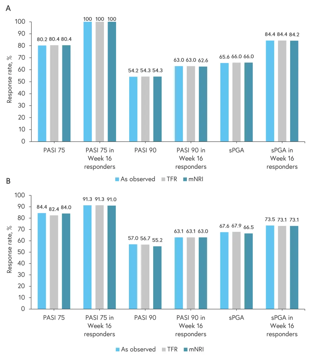 mNRI, modified non-responder imputation; PASI, Psoriasis Area and Severity Index; sPGA, static Physician’s Global Assessment; TFR, treatment failure rules.