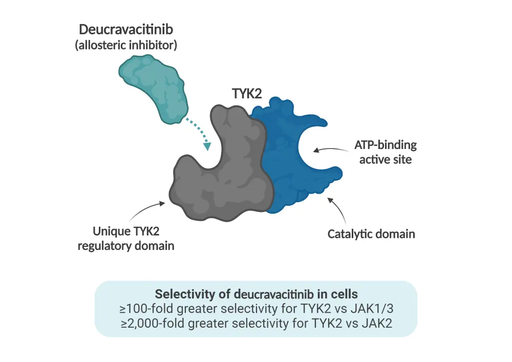 Deucravacitinib is a novel, oral, selective TYK2 inhibitor, recently approved by the U. S. Food and Drug Administration for the treatment of adults with moderate-to-severe plaque psoriasis. Deucravacitinib exhibits a unique mechanism of action, distinct from other JAK inhibitors, by binding to the regulatory domain of TYK2 and inhibiting the enzyme by locking it in an inactive state (Figure 1).1,2