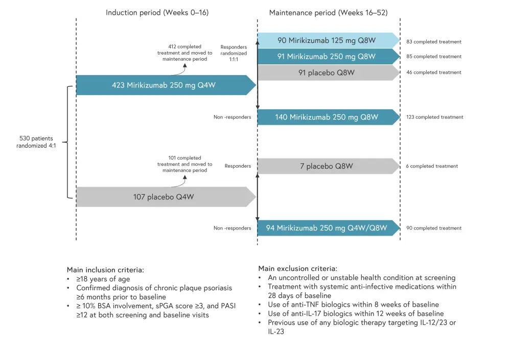 The primary outcomes were the proportion of mirikizumab treated patients achieving a static physician’s global assessment (sPGA) score of 0 or 1 compared with placebo at Week 16, a ≥2-point improvement from baseline, and the proportion of patients achieving PASI 90.