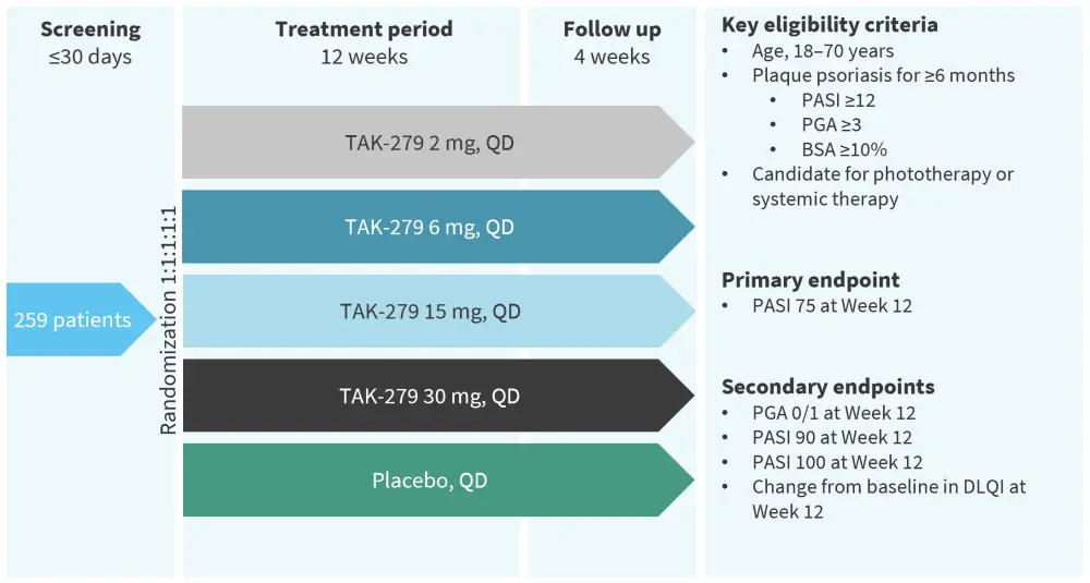 The phase IIb randomized, multicenter, double-blind, placebo-controlled study was designed to assess the efficacy, safety, and tolerability of TAK-279 in adult patients with moderate-to-severe plaque psoriasis. Patients were randomized (1:1:1:1:1 ratio) to receive one of four doses of TAK-279 (2 mg, 5 mg, 15 mg, or 30 mg once daily [QD]) or the placebo for 12 weeks. The detailed study design is illustrated in Figure 1.