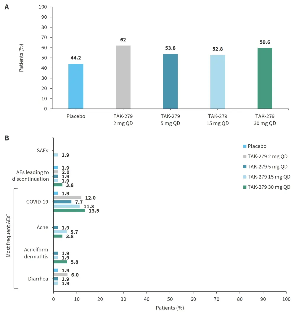 The frequency of adverse events (AEs) was 53–62% in the treatment arms and 44% in the placebo arm (Figure 3A). Two serious AEs occurred in one patient on TAK-279 15 mg and were considered unrelated to the treatment (Figure 3B). The most common treatment-emergent AEs (TEAEs) were COVID-19, acne, acneiform dermatitis, and diarrhea. Few patients with TEAEs (1–2 per treatment group) discontinued the treatment. No deaths were reported.