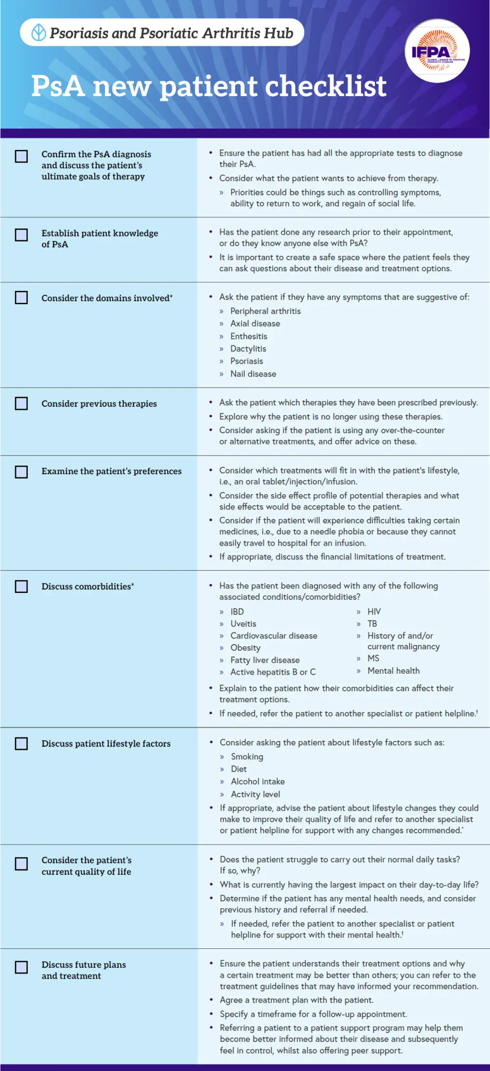 The Psoriasis and Psoriatic Arthritis Hub is pleased to present a checklist of key topics to discuss with patients with newly-diagnosed PsA.