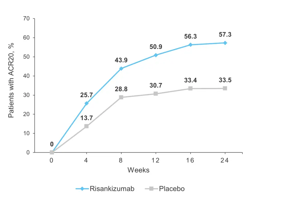 The proportion of patients achieving ACR20 at Week 24 was also significantly higher for the risankizumab group in all the prespecified subgroups defined by demographics (age, sex, and body mass index), baseline disease characteristics (duration of PsA, presence of enthesitis, and presence of dactylitis), and use of prior concomitant therapy. In addition, ACR20 at Week 24 was significantly higher in patients treated with risankizumab compared with placebo, irrespective of whether patients received concomitant csDMARDs (57.9% vs 35.9%) or risankizumab monotherapy (55.5% vs 26.2%). Similarly, the risankizumab group showed a greater proportion of patients achieving ACR50 and ACR70 at Week 24 compared to placebo.