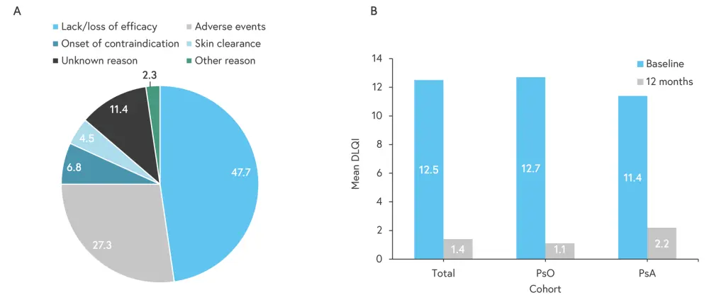 Figure 1. A Reasons for discontinuation of brodalumab and B mean DLQI from baseline to 12 months*