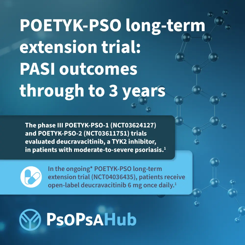 In the long-term extension of the POETYK-PSO-1 and -2 trials, efficacy of deucravacitinib including achievement of treat-to-target thresholds, was maintained up to 148 weeks, with a consistent safety profile.