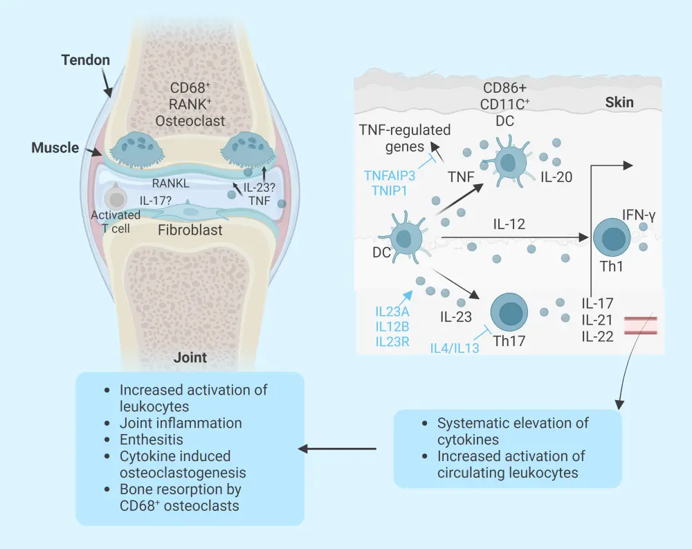 The pathophysiology of PsA is not fully understood but is underpinned by cytokine and immune cell responses (Figure 3). In joints affected by PsA, there are increased levels of T cells and cytokines, including tumor necrosis factor and interleukin-6, -12, -17, and -23.3 This drives osteoclast activation and inflammation within the joint.3