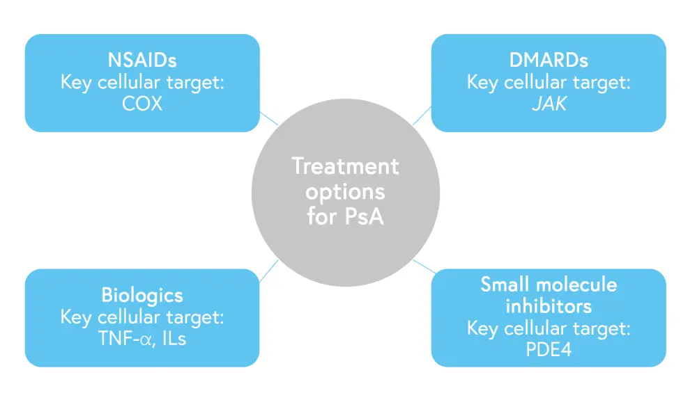 COX, cyclooxygenase; DMARD, disease-modifying antirheumatic drugs; IL, interleukin; JAK, Janus kinase; NSAID, non-steroidal anti-inflammatory drug; PDE, phosphodiesterase; PsA, psoriatic arthritis; TNF, tumor necrosis factor.