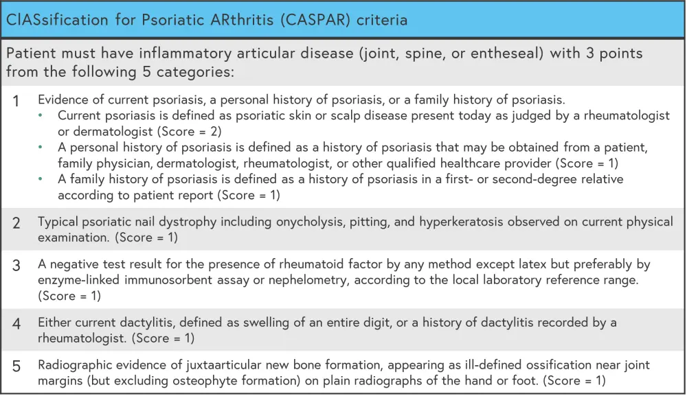 Diagnosis of PsA is based on evaluation of the patient’s history combined with physical examination. Imaging and laboratory workups can support the diagnosis.5 The classification criteria for PsA (CASPAR) can help to diagnose PsA.6 It states that patients must have inflammatory articular disease (joint, spine, or entheseal) and 3 points from five categories (Figure 5) to meet the criteria for a PsA diagnosis.6 As such, PsA can be diagnosed even if rheumatoid factor is present and psoriasis is absent.6
