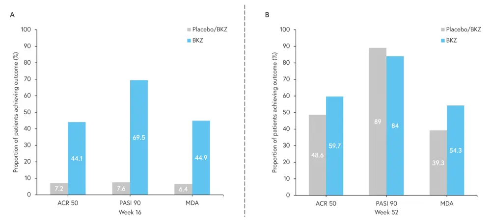 ACR 50, 50% improvement in American College of Rheumatology score; BKZ, bimekizumab; MDA, minimal disease activity; PASI 90, 90% improvement in Psoriasis Area and Severity Index.
