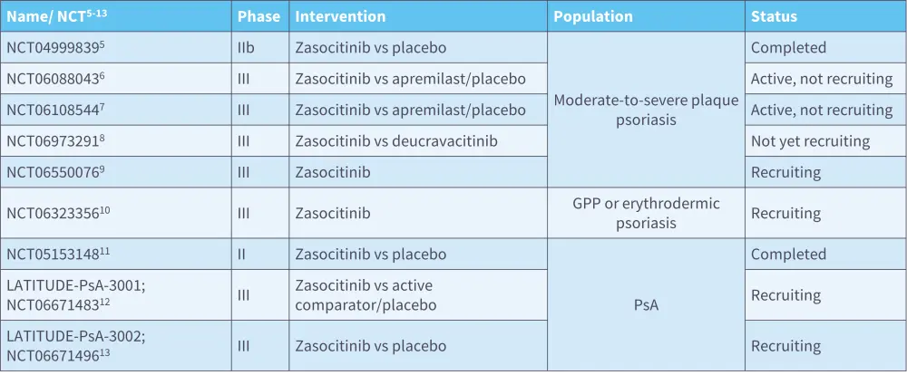 Zasocitinib is a TYK2 inhibitor in late-stage clinical development (Table 1)5–13 and has been found to be efficacious and tolerable in both PsO14 and PsA15 (Figure 1 and Figure 2).