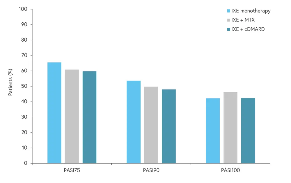cDMARD, conventional disease modifying antirheumatic drug; IXE, ixekizumab; MTX, methotrexate; PASI, Psoriasis Area and Severity Index; PASI75, ≥75% reduction in PASI score from baseline; PASI90, ≥90% reduction in PASI score from baseline; PASI100, 100% reduction in PASI score from baseline.
