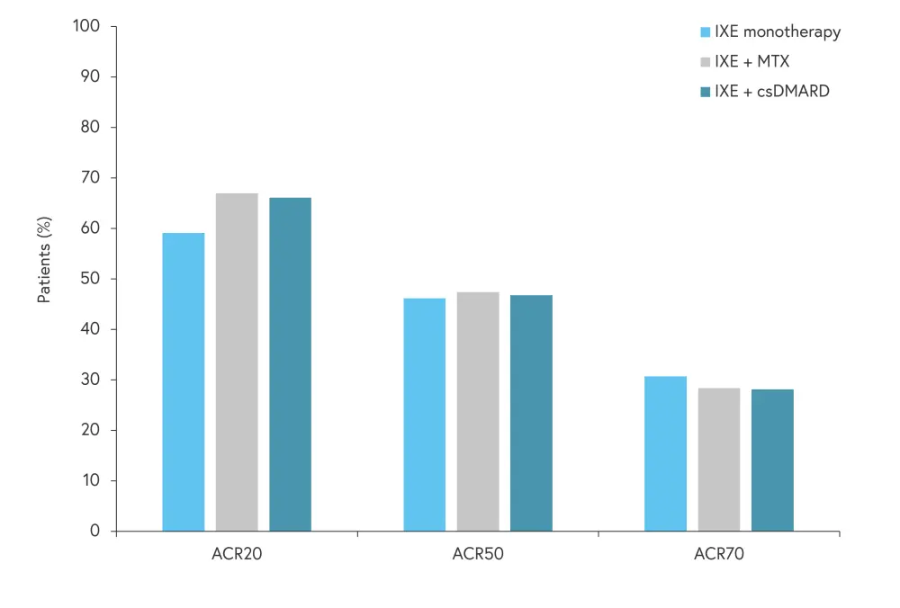 ACR, American College of Rheumatology; ACR20, ≥20% improvement in ACR response; ACR50, ≥50% improvement in ACR response; ACR70, ≥70% improvement in ACR response; cDMARD, conventional disease-modifying antirheumatic drug; IXE, ixekizumab; MTX, methotrexate.