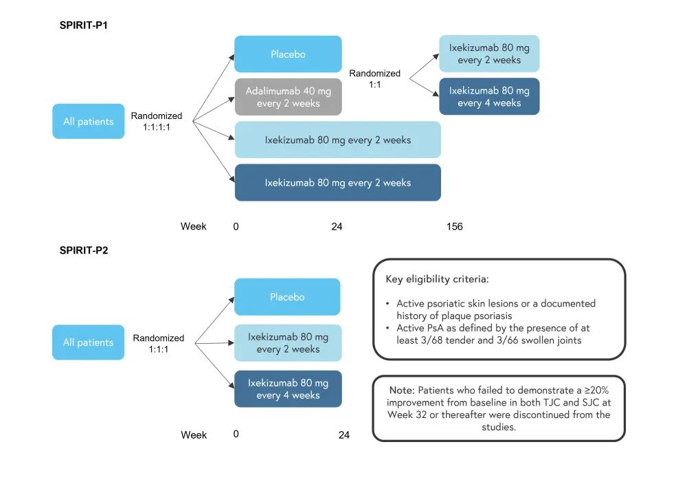 SPIRIT-P1 and SPIRIT-P2 were both multi-center, double-blind, randomized phase III trials. The study design of both trials is shown in Figure 1. Patients in SPIRIT-P1 received treatment for up to 152 weeks, while patients in SPIRIT-P2 received treatment for 24 weeks but were evaluated for long-term safety and efficacy up to 156 weeks. Some patients were also receiving methotrexate, or another cDMARD, while on IXE.