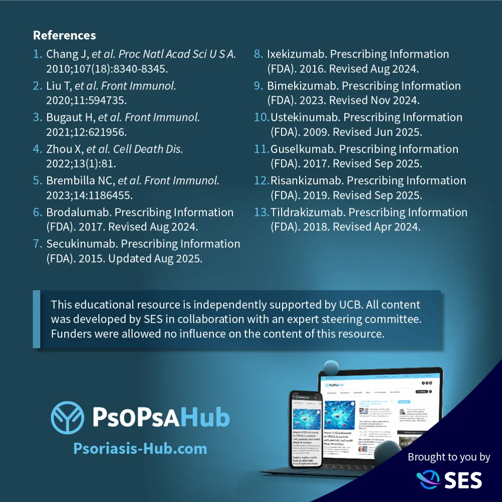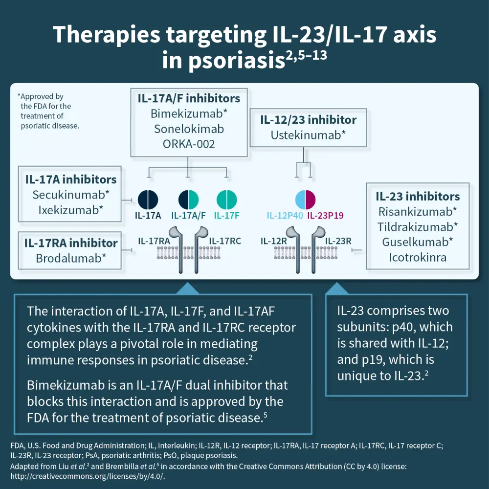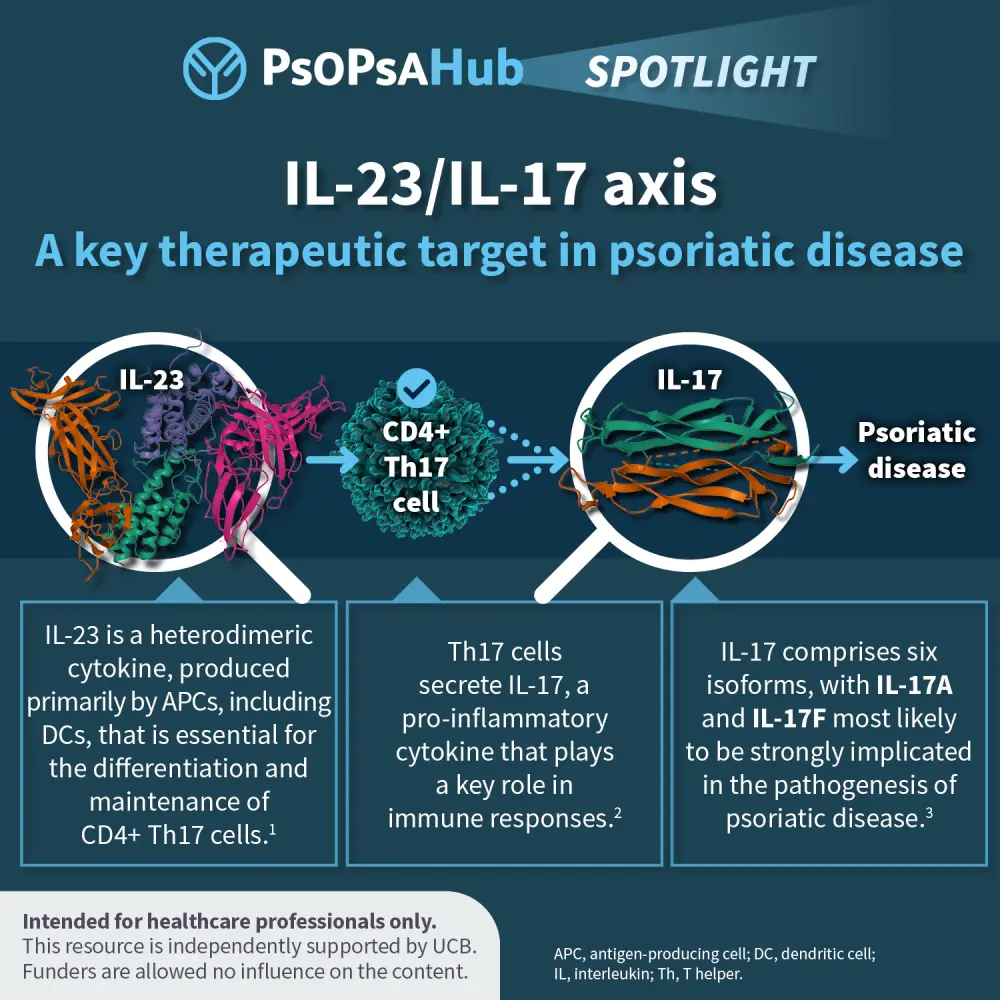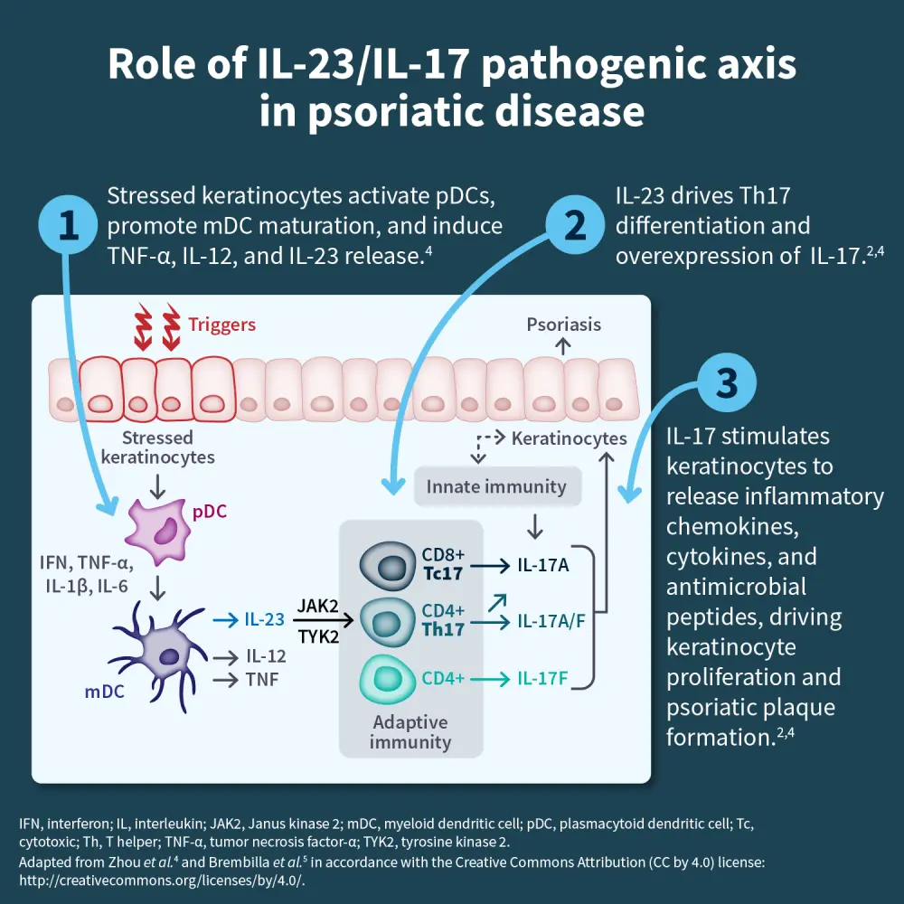 Psoriasis is a chronic autoimmune inflammatory disease, involving both innate and adaptive immune responses. A key driver of its pathogenesis is the interleukin (IL)-23/IL-17 axis, which plays a central role in driving the inflammatory cascade. Targeting this pathway has significantly transformed the treatment landscape, offering effective options for both plaque psoriasis and psoriatic arthritis.