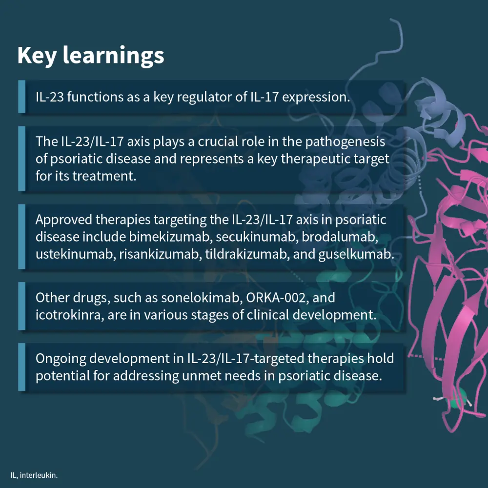 Below, we summarize the immunopathogenic role of the IL-23/IL-17 axis and its relevance as a therapeutic target in psoriatic disease.
