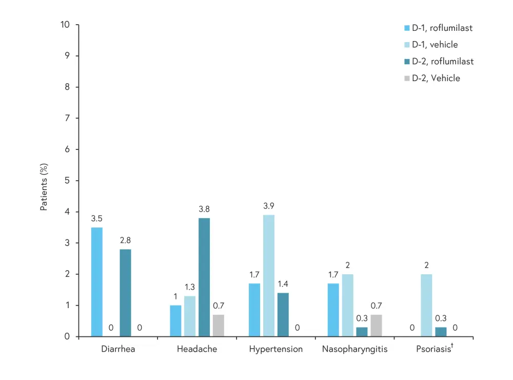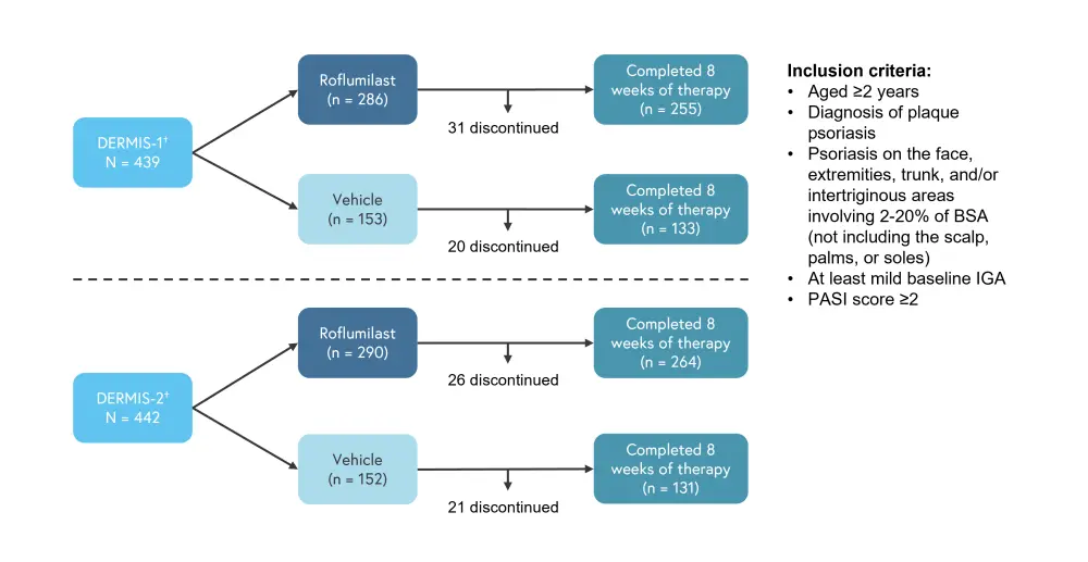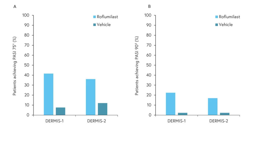 In both DERMIS-1 and DERMIS-2, roflumilast cream showed significant efficacy at 8 weeks from baseline in patients with chronic plaque psoriasis compared with the vehicle control. IGA success at Week 8 was improved, with significant improvements seen in intertriginous-IGA status. In roflumilast and vehicle treatment cohorts, similar occurrence of TEAEs was observed across both trials, with an overall low occurrence of serious adverse events.