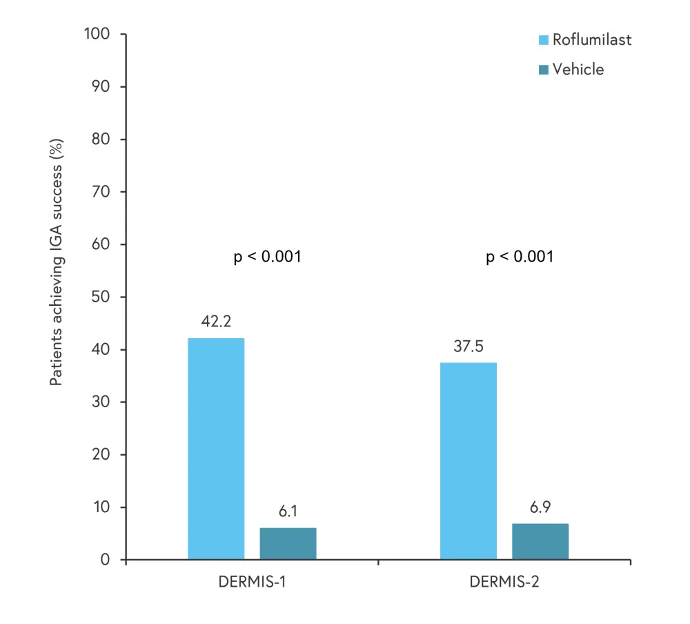 IGA success outcomes in DERMIS-1 and DERMIS-2 trials are shown in Figure 2. At Week 8 from baseline, IGA success was significantly higher in patients treated with roflumilast compared with the vehicle cream in both trials.