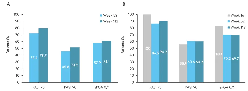 Figure 1. A Responses in all patients who received deucravacitinib continuously and B responses in patients who achieved PASI 75 at Week 16*†