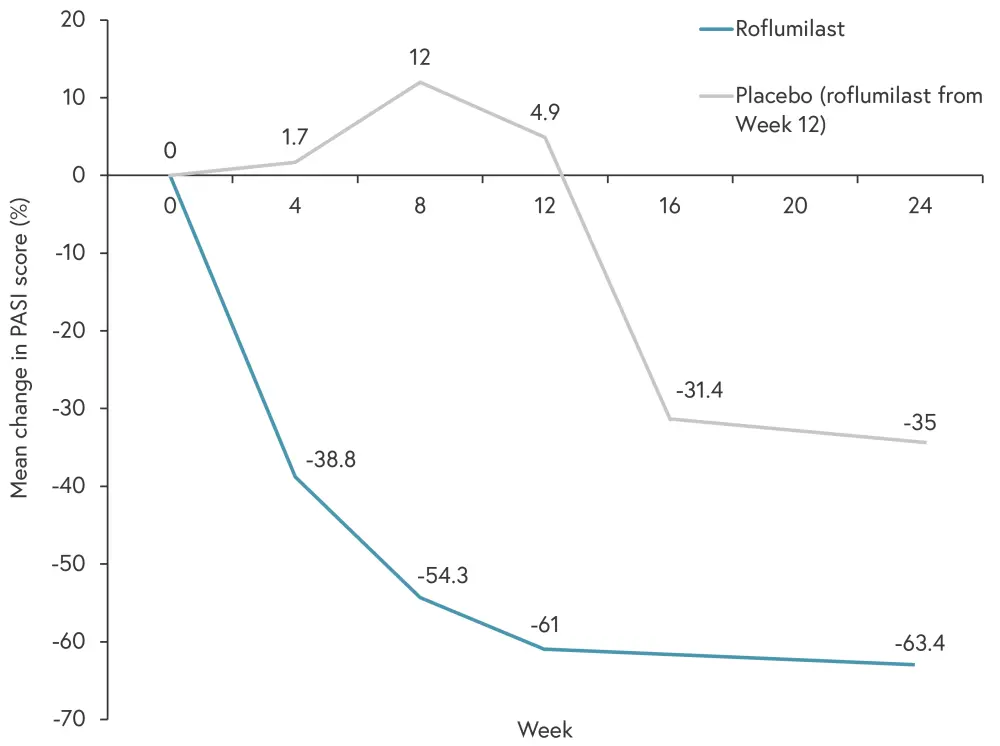 Patients treated with roflumilast had a consistent improvement in PASI score over 24 weeks. Patients treated with placebo experienced an increase in PASI score, which then decreased from Week 12 after switching to roflumilast, as shown in Figure 4.