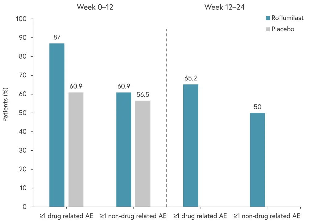 Roflumilast was generally well tolerated. The most common adverse events up to Week 12 were weight loss, occurring 82.6% and 39.1% of patients receiving roflumilast and placebo, respectively; and reduced appetite, occurring in 60.9% and 43.5%, respectively. The incidence of adverse events up to Week 24 is shown in Figure 2.
