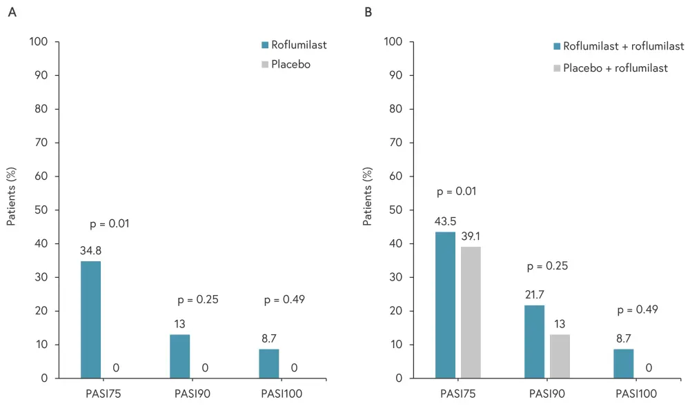 The primary endpoint of the study was met, with 34.8% of patients who had been treated with roflumilast achieving PASI75 at Week 12. The percentage of patients in both treatment arms achieving PASI75, PASI90, and PASI100 up to Week 24 is shown in Figure 3.