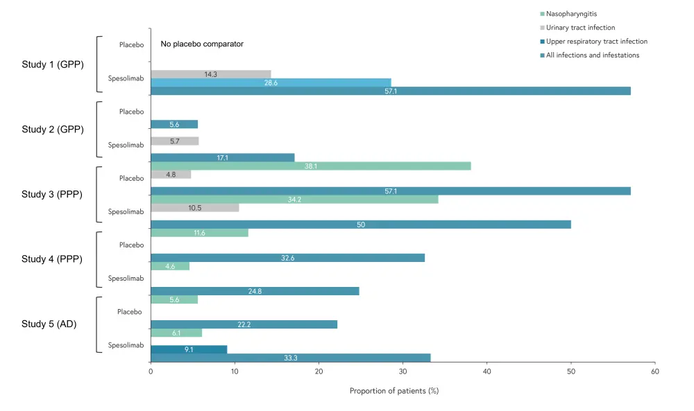 The rate ratio of adverse events (AEs) for spesolimab versus placebo was 1.3, 0.9, 0.9, and 1.2 for studies 2, 3, 4, and 5, respectively. Adverse event occurrence, including severe and serious AEs, is shown in Figure 1; there were no patient deaths reported across the five studies. Infections were mostly mild and uncomplicated, the most common are outlined in Figure 2. Two of the placebo-controlled trials demonstrated a lower infection rate in the spesolimab group (Trial 3 and Trial 4), while two showed a lower infection rate in the placebo group (Trial 2 and Trial 5). Upper respiratory tract infections were most common but others, such as urinary tract infections, were also reported.