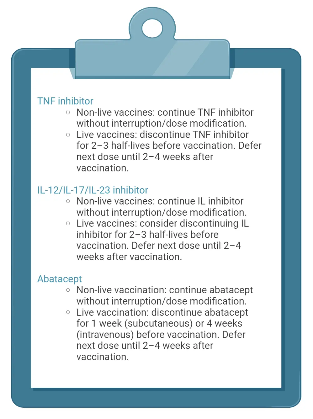 Here, we summarize recommendations by Chat et al. published in Journal of the American Academy of Dermatology, on the use of biologics and oral treatments in patients with psoriatic disease receiving vaccinations.