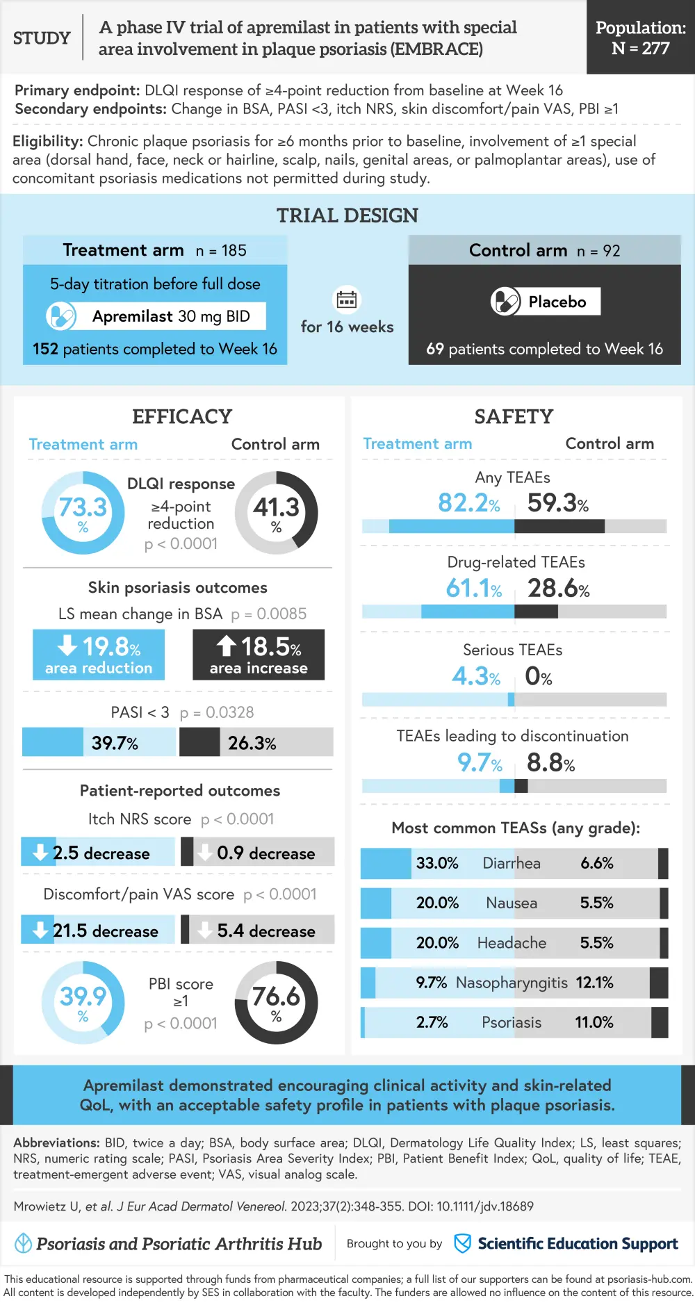 The Psoriasis and Psoriatic Arthritis Hub is pleased to present a visual abstract representing key data from the phase IV EMBRACE trial (NCT03774875), which investigated the efficacy and safety of apremilast in patients with plaque psoriasis and involvement of at least one special area (dorsal hand, face, neck or hairline, scalp, nails, genital areas, or palmoplantar areas). This was a randomized, placebo-controlled trial, which compared apremilast 30 mg twice daily for 16 weeks to placebo.1