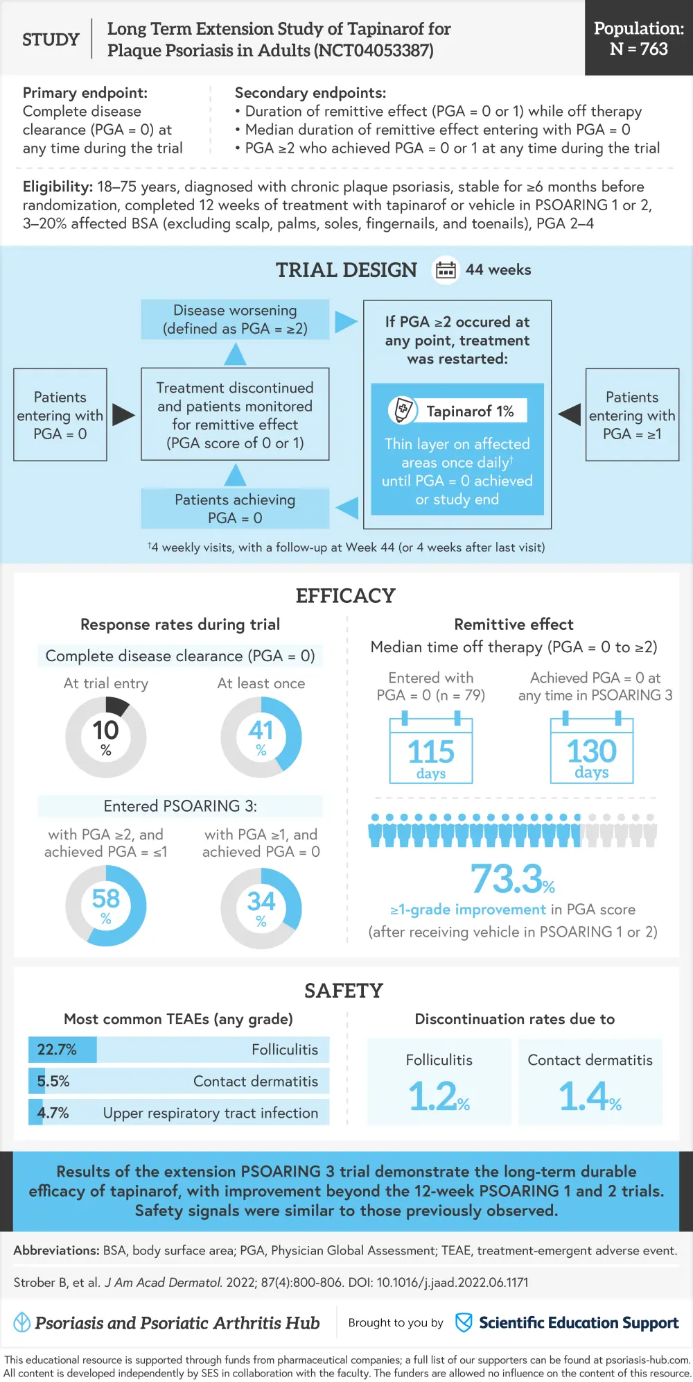 The Psoriasis and Psoriatic Arthritis Hub is happy to present a visual abstract summarizing key findings from the phase III PSOARING 3 trial evaluating the long-term efficacy and safety of tapinarof 1% cream in patients with plaque psoriasis. Included patients had received 12 weeks of prior treatment with tapinarof or vehicle cream PSOARING 1 or 2 trials.