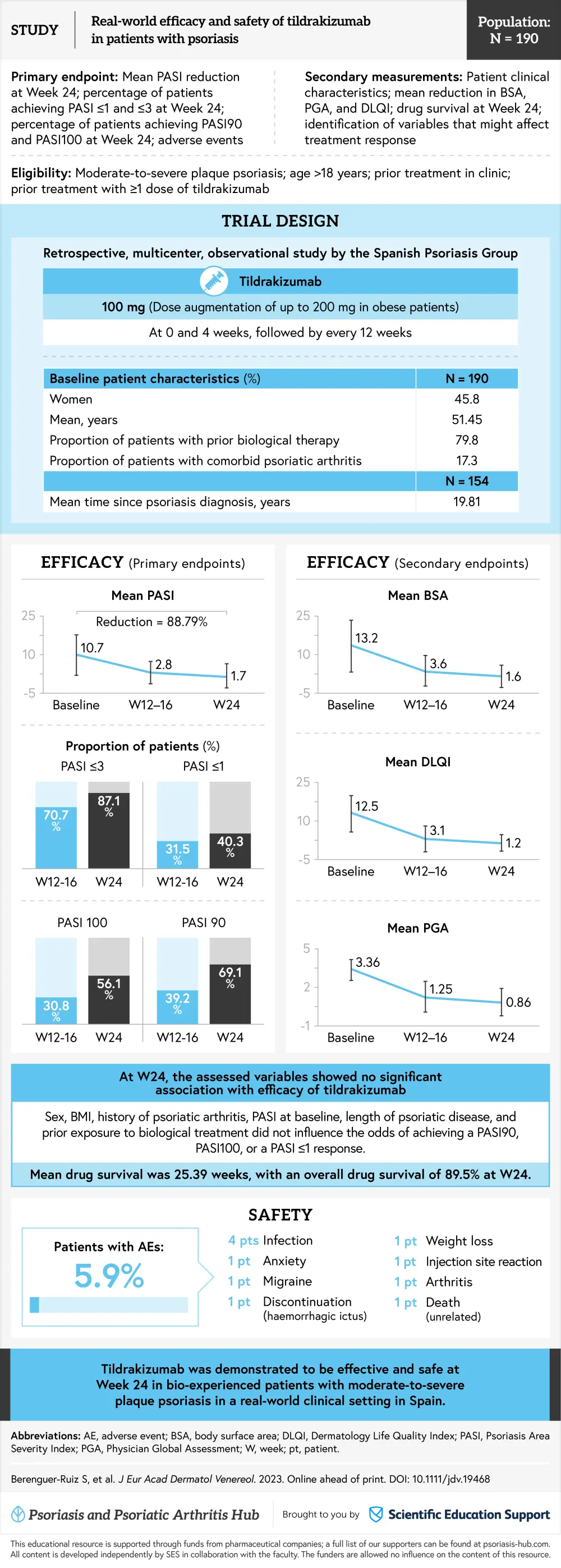 The Psoriasis and Psoriatic Arthritis Hub is pleased to present a visual abstract summarizing efficacy and safety of tildrakizumab in a real-world cohort of patients with moderate-to-severe plaque psoriasis in Spain.